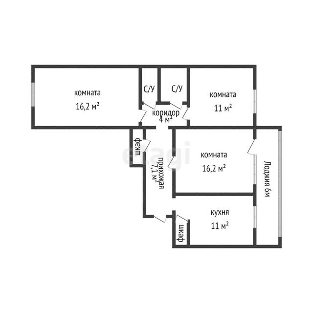 Общая площадь 71 кв.м. кухня просторная 11 кв.м. Сан. узел раздельный, комнаты изолированы. Не угловая. Имеется гардеробная и кладовка на кухне.